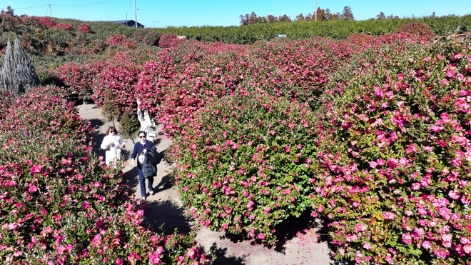 겨울 제주의 상징인 동백꽃이 절정에 달한 지난달 31일 제주 서귀포시 안덕면의 한 수목원 카페를 찾은 관광객들이 꽃이 활짝 핀 동백숲을 거닐고 있다.