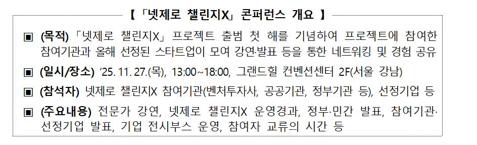 넷제로 챌린지X」는 탄소중립·녹색성장 분야의 '혁신기술'을 보유한 스타트업을 발굴하여 육성하는 민·관 합동 범국가 탄소중립 프로젝트이다.