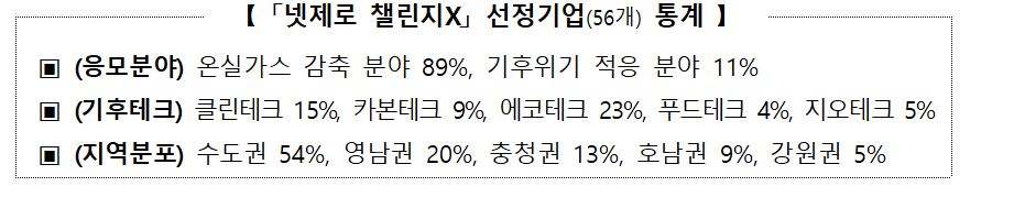 올해 총 305개 스타트업이 지원하였고, 이 중 56개 스타트업이 "참여기관의 기술·사업성 평가"와 "독립위원회의 탄소중립 기여도 평가"를 통해 첫 「넷제로 챌린지X」에 최종 선정되었다.
