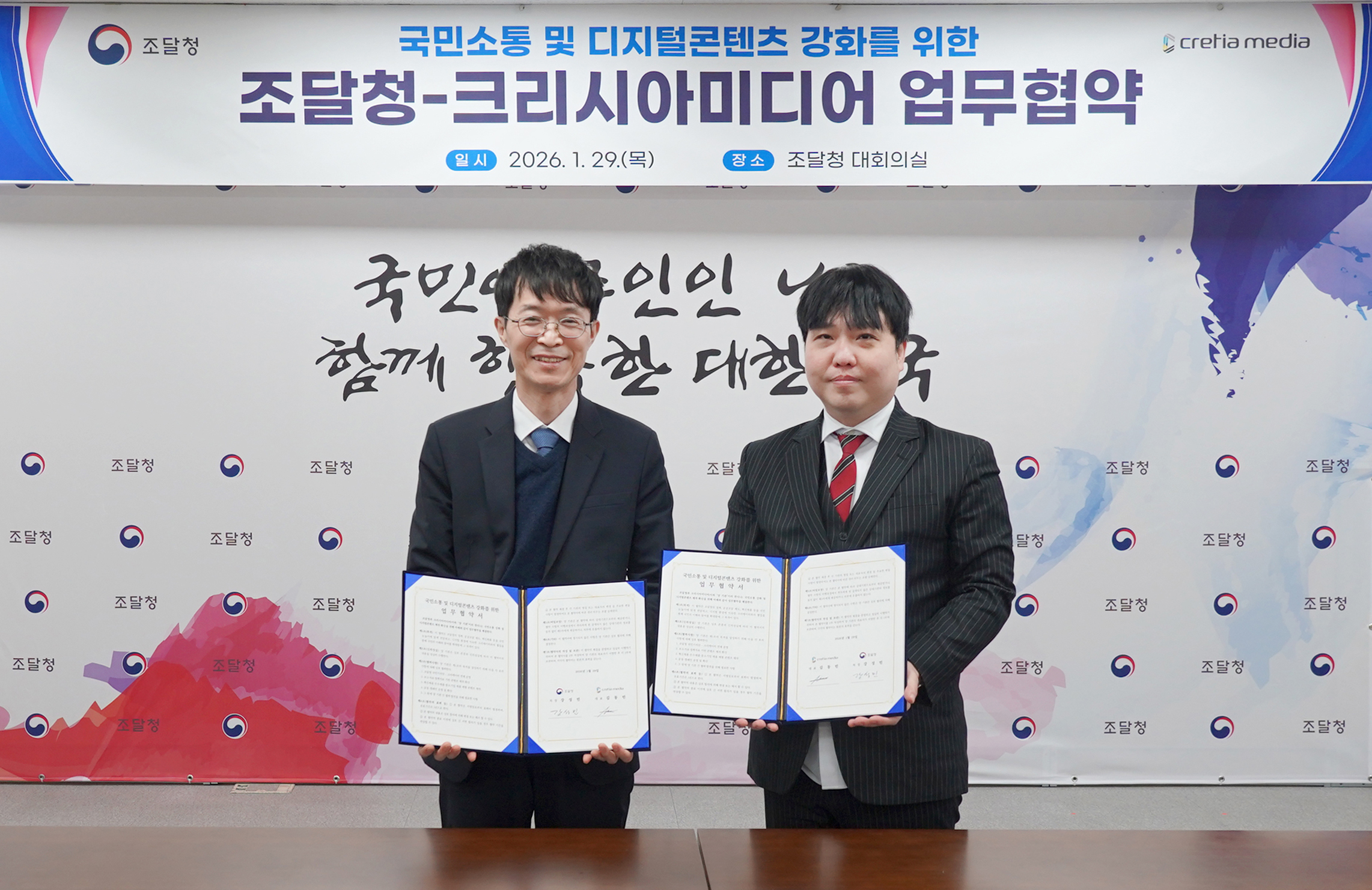 ▶ 강성민 조달청 차장과 김동민 크리시아미디어 대표가 29일 정부대전청사에서 정책소통 활성화를 위한 업무협약을 체결한 후 기념촬영을 하고 있다.