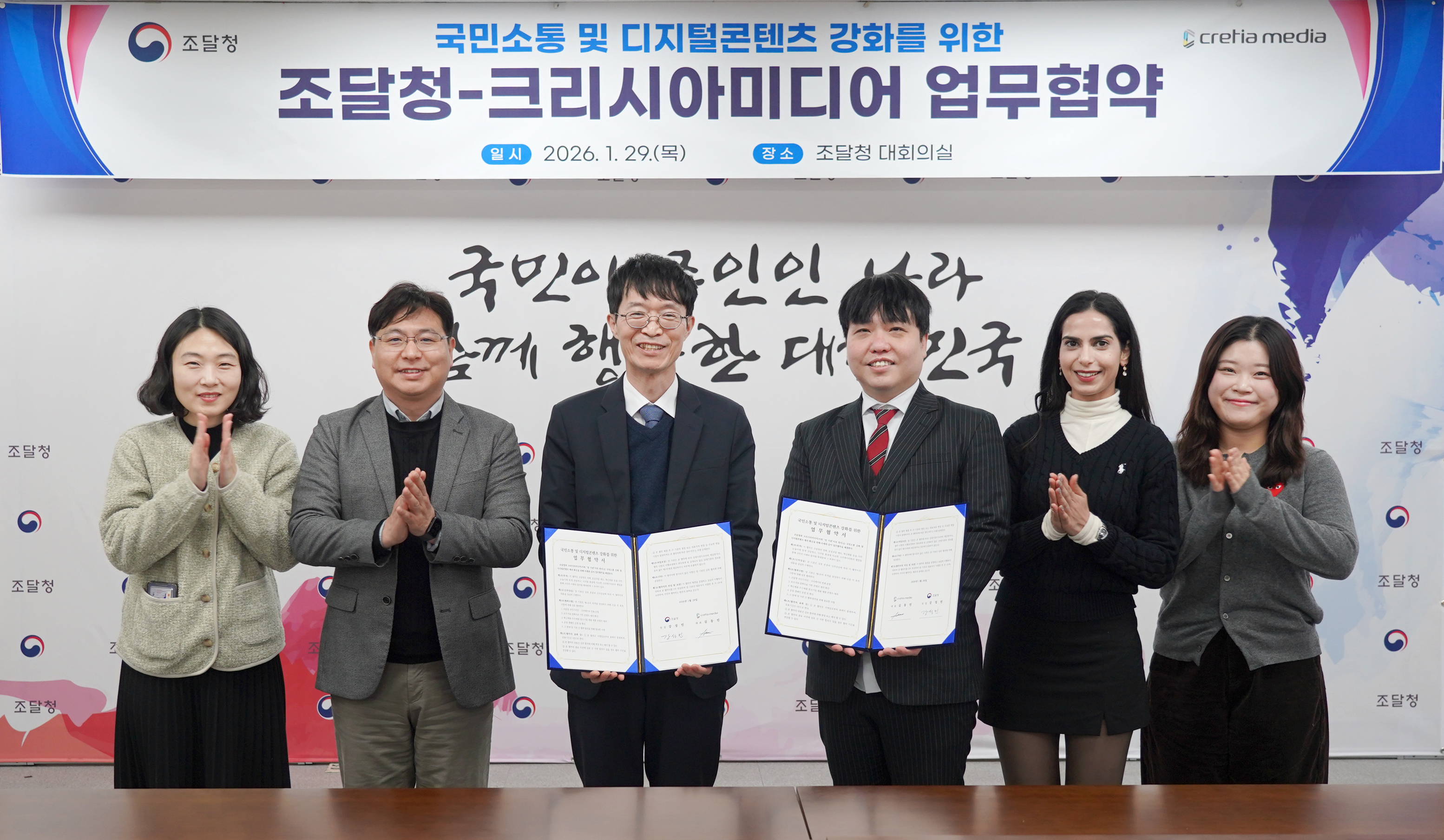 조달청(청장 백승보)은 1월 29일(목) 정부대전청사에서 다중 채널 네트워크(MCN)* 기업인 크리시아미디어와 정책소통 활성화를 위한 업무협약(MOU)을 체결했다고 밝혔다.